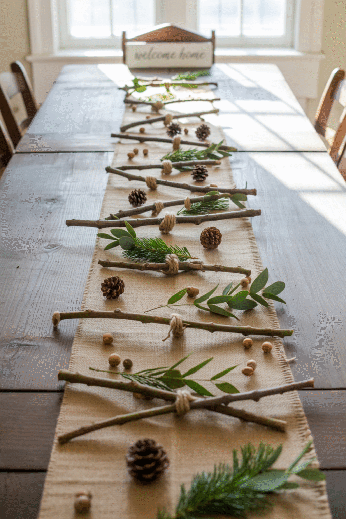Cut burlap to your table’s length, lay it flat, and arrange twigs diagonally across the runner. Tie with twine at intersections. Tuck in sprigs of greenery and pinecones for texture. I use this one every year, and guests always ask where I bought it.