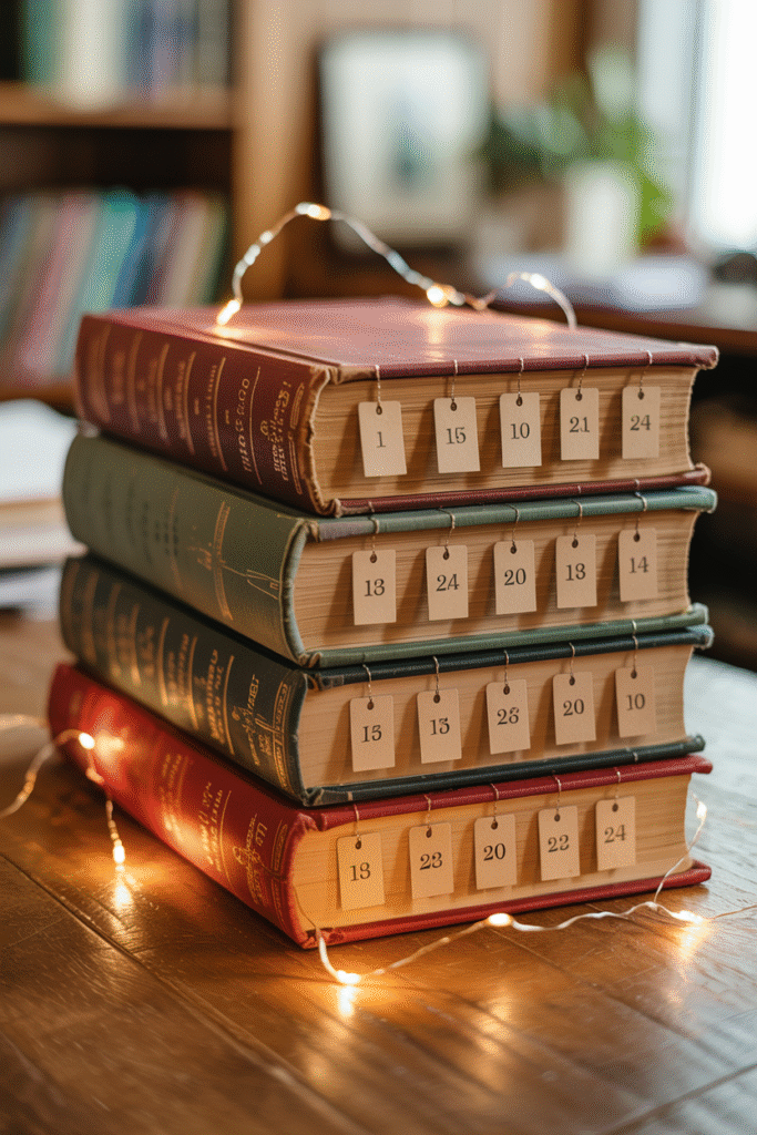 Choose three thick books, stack them, and glue 24 small envelopes (label with numbers 1–24) to the covers. Fill each with a slip of paper—a holiday activity, treat, or mini gift card. This one doubles as decor and a fun tradition. I did this for my neighbor’s kids last year, and they loved the daily surprise.