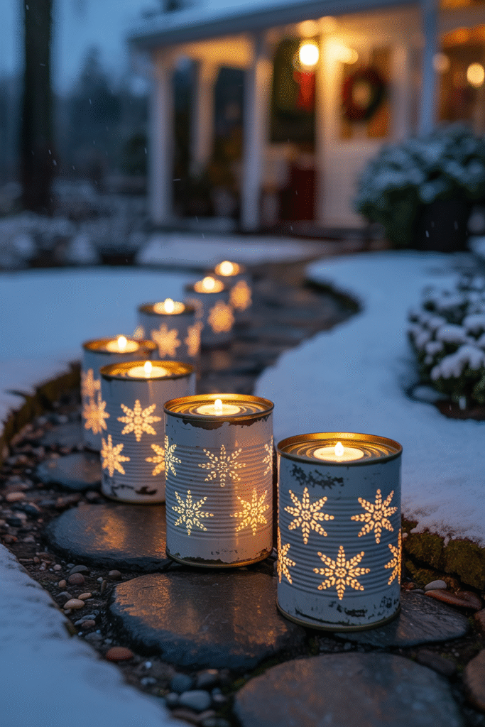 Poke small holes in your cans with an awl (or hammer and nail) to create stars, Christmas trees, or simple dots. Place a battery tea light inside. I use these outdoors along my front path, but they work indoors too—just skip the real candles for safety.