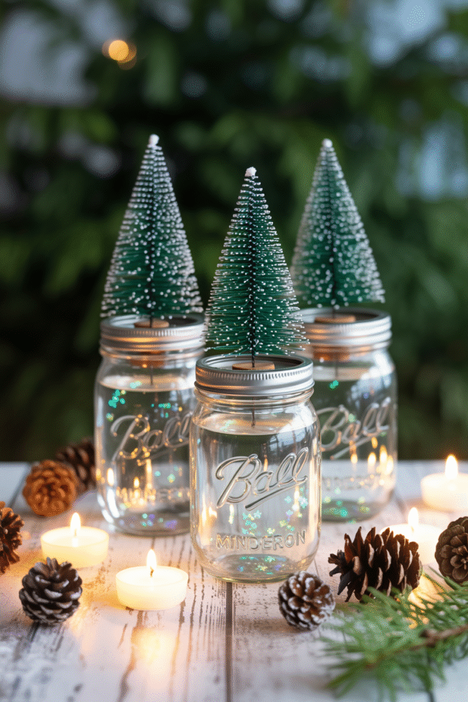 Materials: Small mason jars (250–500 ml / 1–2 cups), small plastic Christmas trees or figurines, white glitter, glycerin (optional), glue