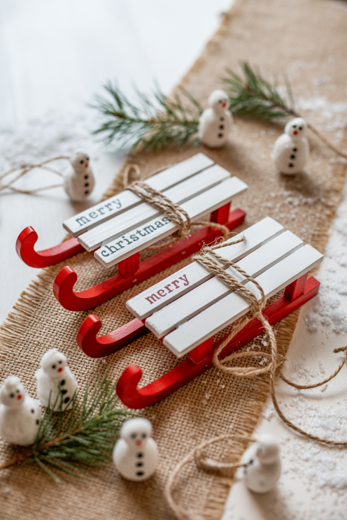 One of my favorite discoveries: hot glue two full clothespins together (flat sides out) at a slight angle to make a sled shape. Paint them red, white, or leave them bare for a natural look. Glue a twine “pull,” add mini reindeer or snowmen, and you’ve got instant holiday vignettes.