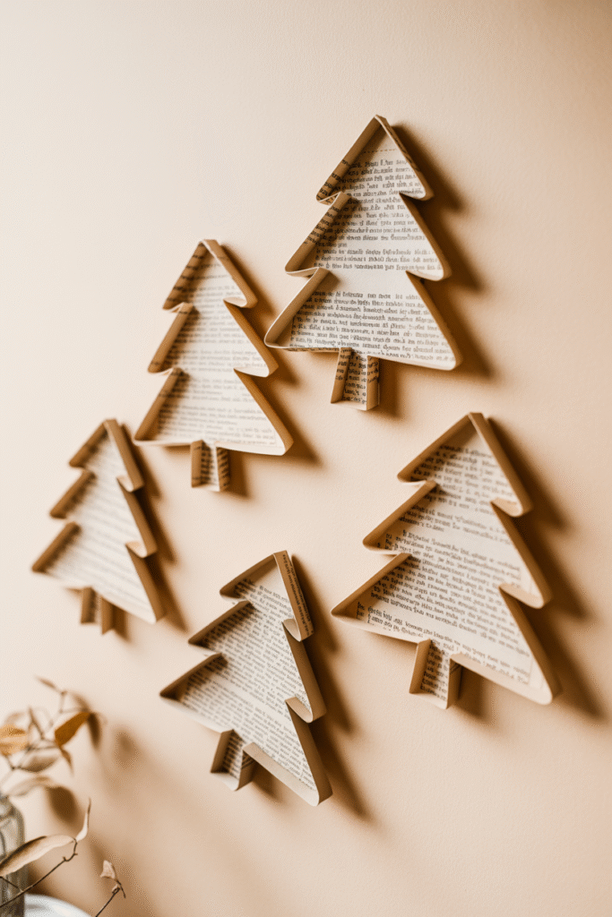 I tried this last year in my living room, and it was a hit—even for guests who aren’t “into” crafts. Gather old books, music sheets, or any neutral-toned paper. Cut out simple tree shapes (you can freehand or use a template), and stick them in a cluster on your main wall with tape or glue dots. They’re lightweight, so no nails are needed.