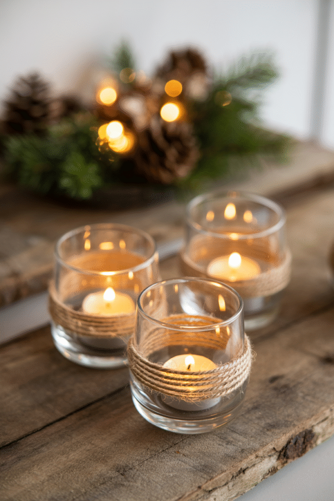 Materials: Plain glass candle holders or jars (12–14 cm tall / 4.5–5.5 in); jute twine; hot glue gun or craft glue; tea lights