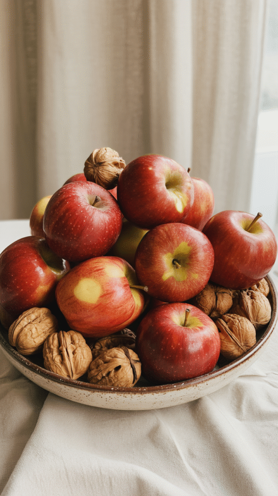 A few falls ago, I heaped shiny red apples into a shallow ceramic bowl and surrounded them with walnuts in the shell. It became the table’s centerpiece and I only spent about ($7).