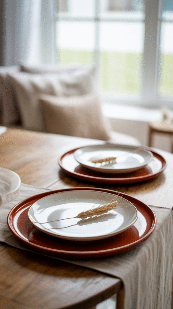 You don’t have to buy all-new dishes. Just changing the chargers or base plates can change the entire mood. A set of deep rust-colored chargers under plain white plates gave my table a completely different feel than the same plates on bare wood.
