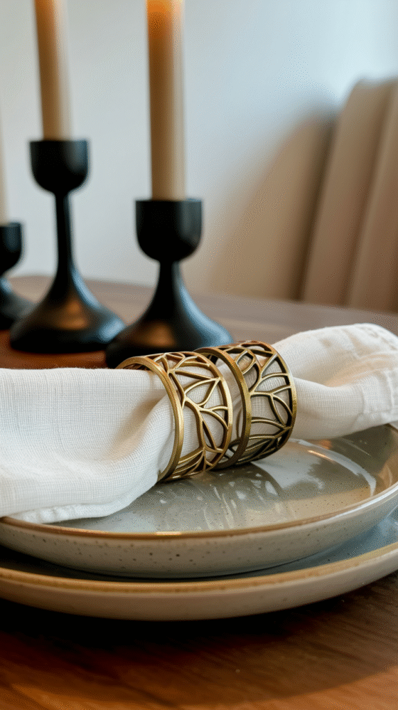 I love a little shimmer in fall decor, but the trick is subtle layering of metals. Brass napkin rings next to matte black candle stands can look modern, not too traditional.