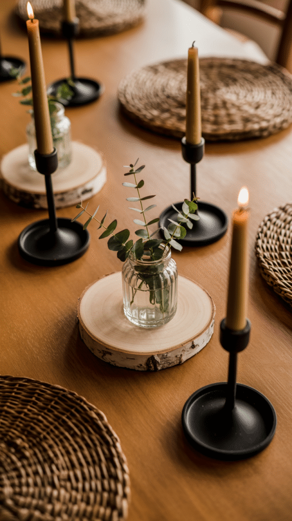 Shiny surfaces need grounding. Whenever I use metallic candle holders or ceramic plates, I balance them with wood slices, wicker chargers, or bamboo trays.