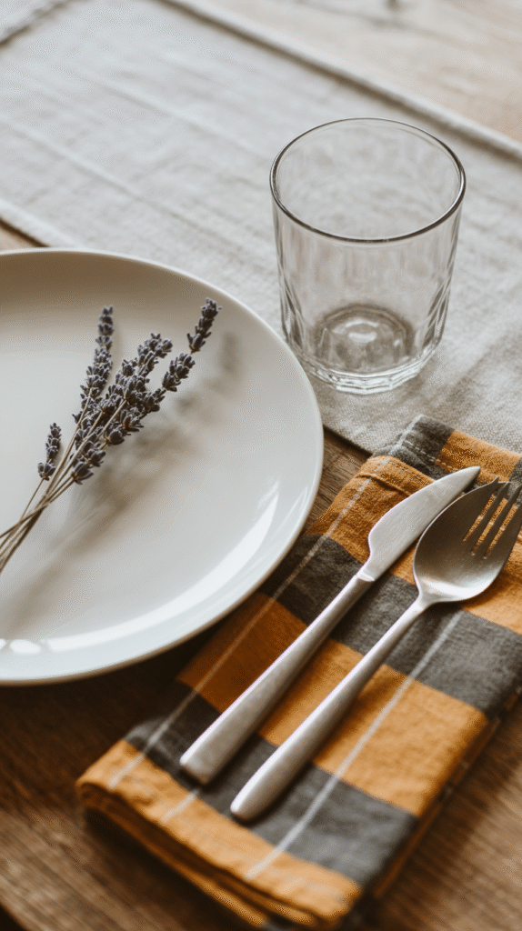 Fabric napkins in plaid patterns instantly say “fall” without screaming it. I fold them simply (no fancy origami—this isn’t a wedding) and tuck them slightly under plates so the color peeks out.