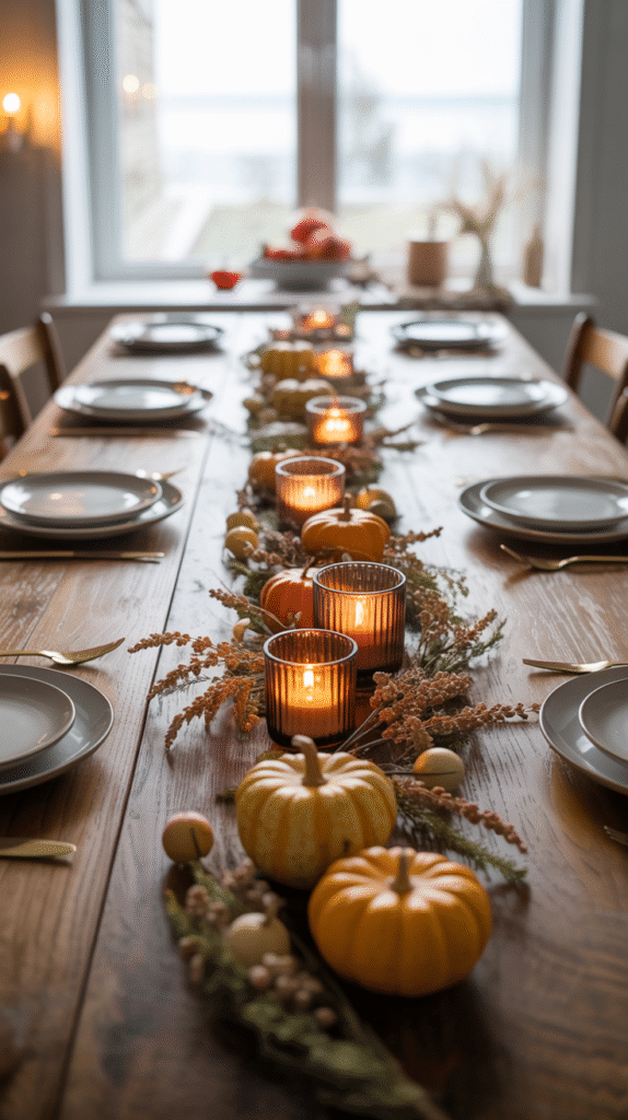 Pumpkins are the obvious fall item, but I avoid piling orange ones everywhere because it can dominate the table. What works best for me is mixing sizes and colors—white mini pumpkins, green heirlooms, even dusty blues.