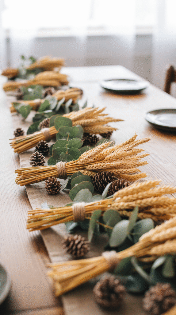 I’ve tied dried wheat into small bunches with twine and laid them flat along a runner. The golden tones immediately made my dark wood table less formal.