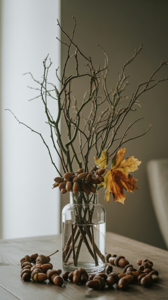 If you like DIY, this is for you. I’ve gone on short walks, collected acorns, dried leaves, and pine branches, then arranged them around a glass vase. It feels authentic because it literally came from your neighborhood.