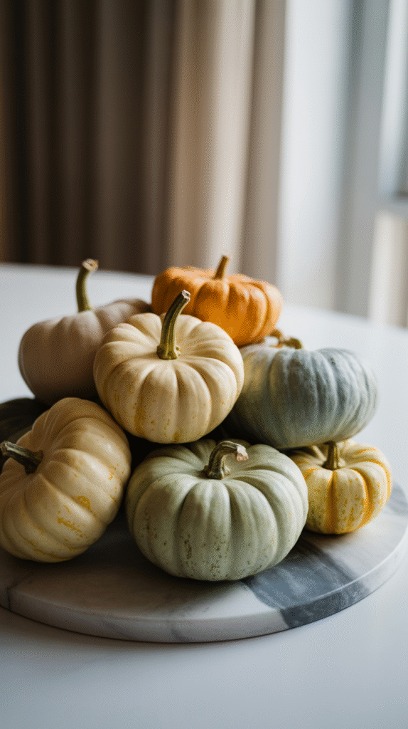 One year, I sprayed mini pumpkins with matte gold paint and clustered them on marble boards. It cost very little and looked high-end.