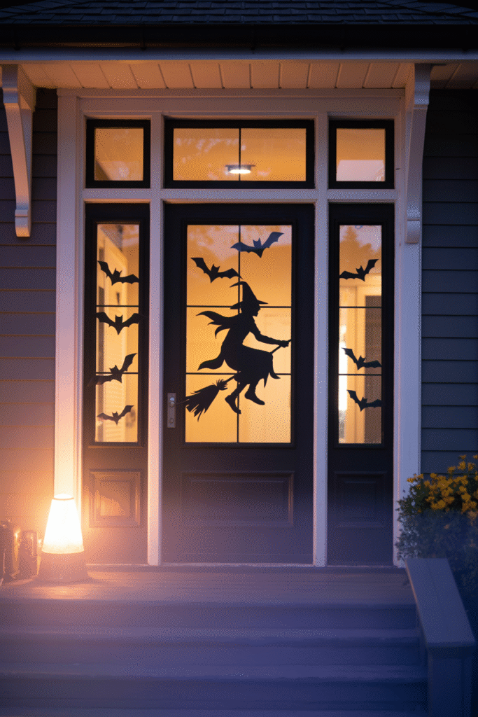 If your porch has sidelights, front windows, or even a glass-paneled door, try silhouette art. I once traced a giant black cat shape from cardboard and taped it against the inner glass. With a small lamp inside, the effect at night was incredible—just a glowing outline that looked like it was watching the street.