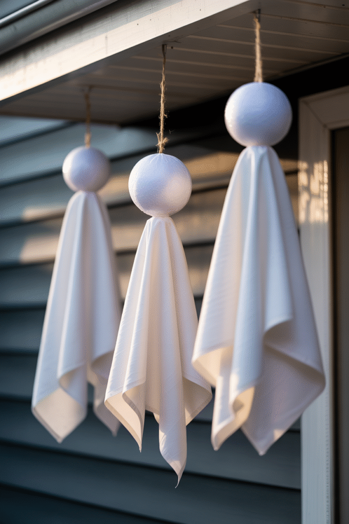 One year my kids begged for movement on our porch, so I made ghosts from simple supplies: white pillowcases, foam balls (15 cm / 6 in), and fabric strips. I hung them with fishing line from tree branches right near the porch edge. They swayed at every breeze, and it startled visitors in the best way.