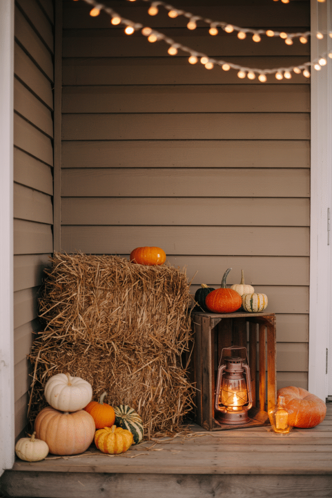 Hay bales are not only autumnal—they’re practical for building height. I once created a rustic backdrop on one side of the porch: