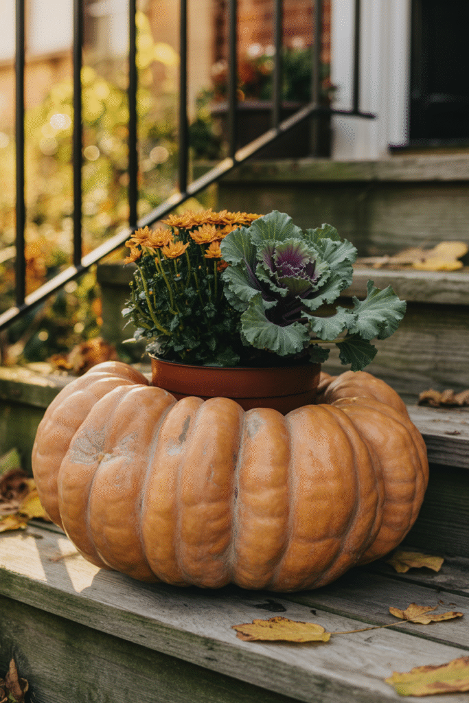 Instead of scattering little ones everywhere, I buy one or two oversized pumpkins (30–40 cm / 12–16 in wide) and hollow them out to use as planters. Pop in autumn flowers like mums (chrysanthemums) or ornamental kale. Since the pumpkin will eventually soften, I place a small plant pot inside the hollowed cavity for easy swapping.