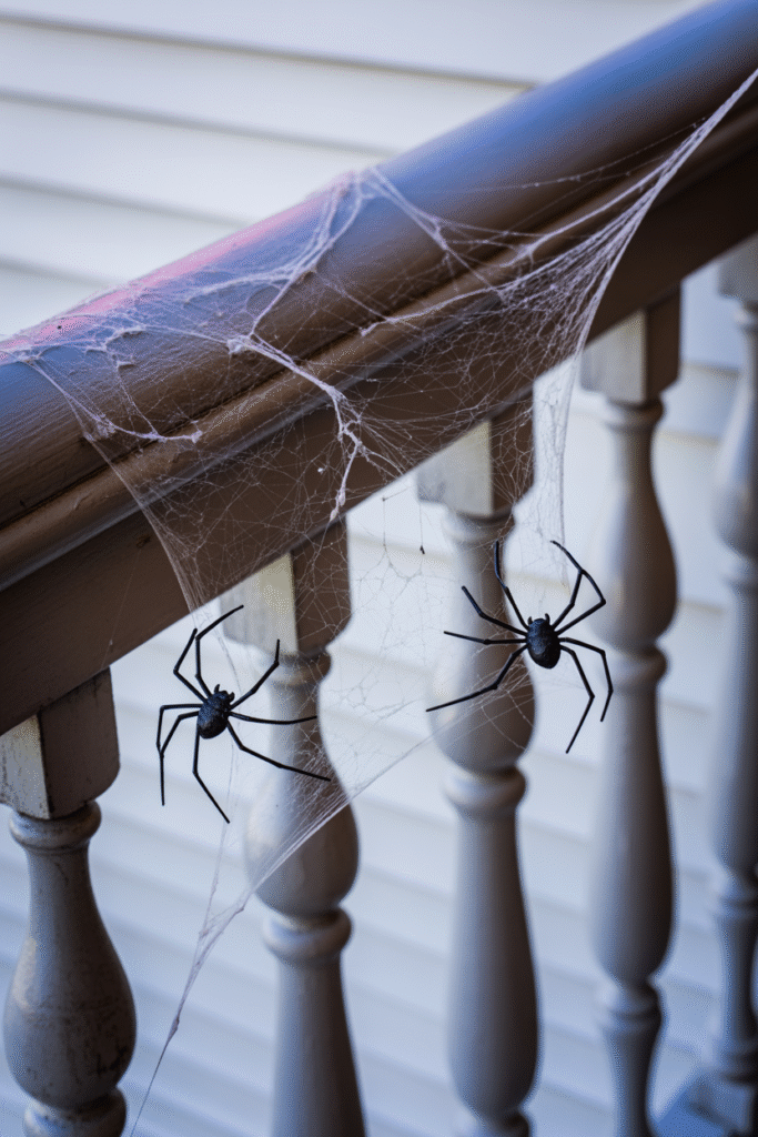 What works best is stretching spider web netting as thin as possible. Anchor just a few corners and pull until nearly transparent. Finish with 2–3 large plastic spiders (10–15 cm / 4–6 in size). When I leave one web slightly crossing the pathway, it always gets a reaction.