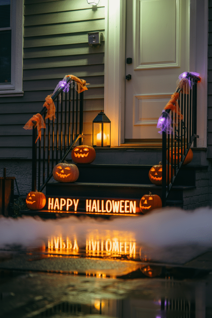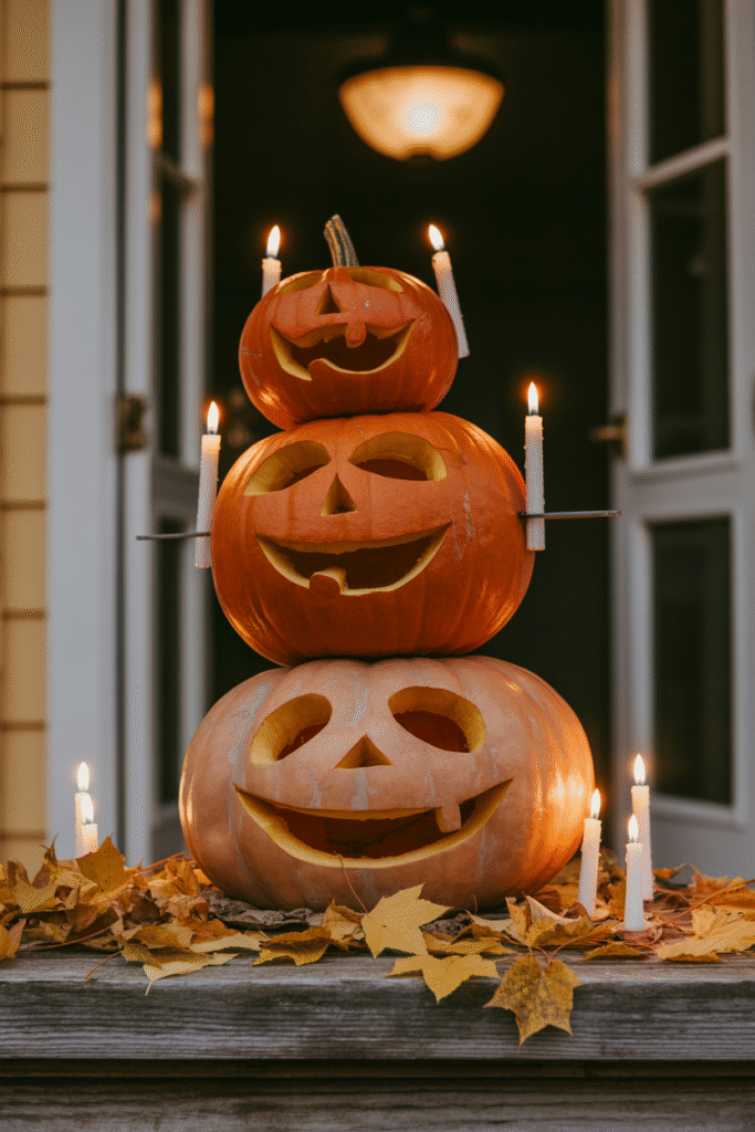 Instead of scattering pumpkins, I stack three at a time (biggest at the bottom, smallest at top) and secure them with skewers. Carve silly or spooky faces, or even paint them solid black for a gothic touch. When lit, the “pumpkin tower” becomes a centerpiece under the porch light.