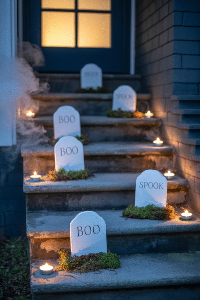 If you have steps leading up to your porch, transform them into a “mini graveyard.”
