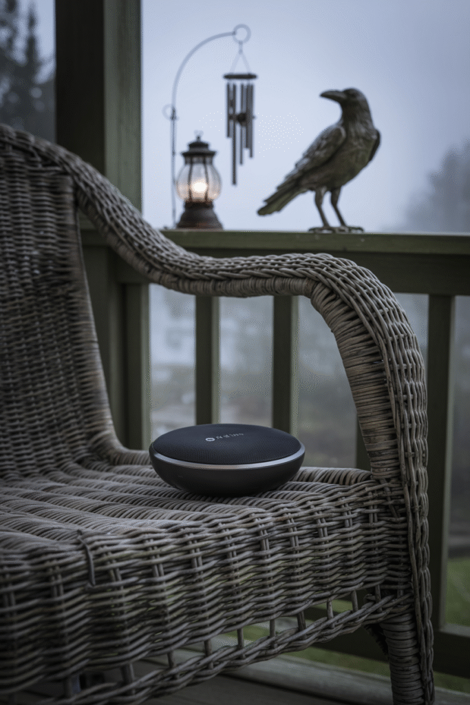 • A hidden Bluetooth speaker under a chair playing a subtle loop of wind howling and crows cawing.