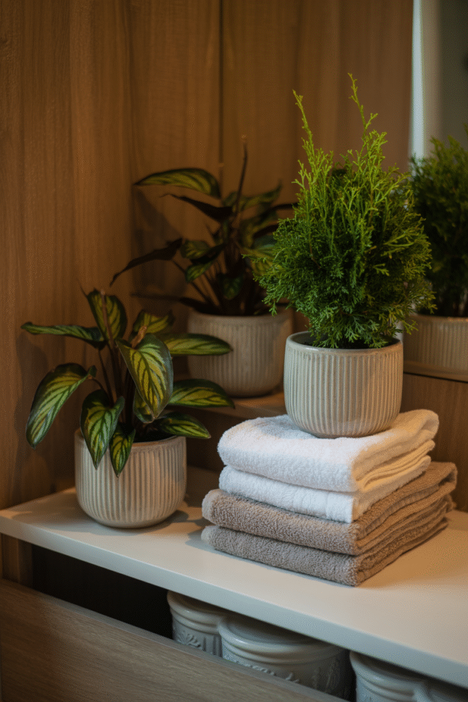 Let’s be honest: not every bathroom is plant-friendly. In one very dark basement bath, I tested both real and realistic faux plants. The faux fiddle-leaf fig looked amazing and never drooped—no one could tell it wasn’t real. Pro tip: If you choose faux, dust regularly and change placement occasionally to avoid a static look.