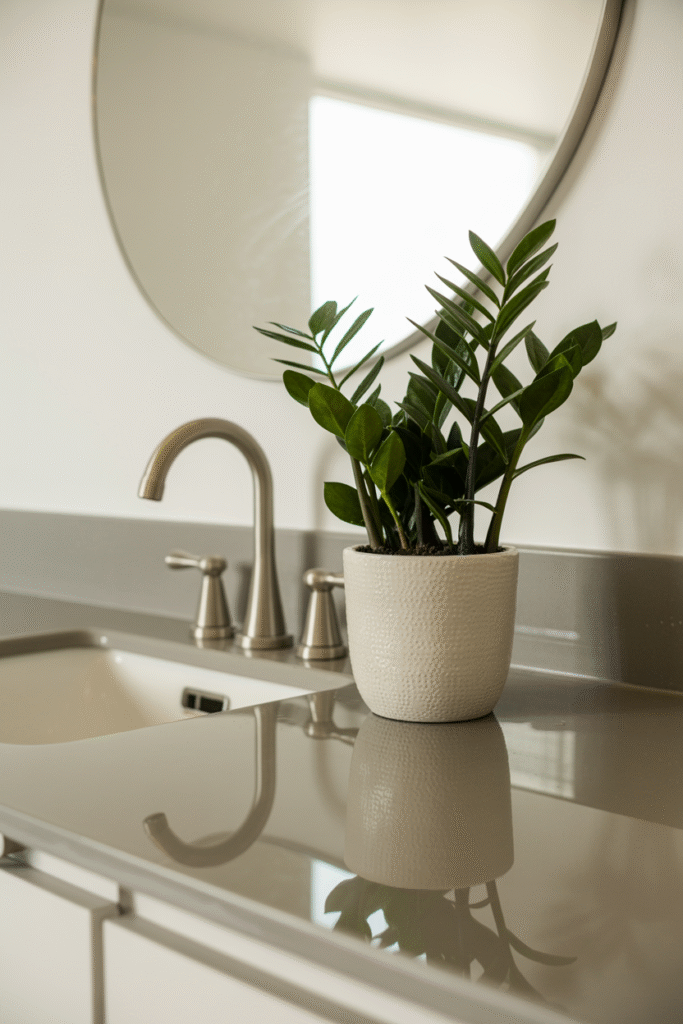 A single, bold plant on the sink counter can become a focal point. In a recent consult, I recommended a ZZ plant in a decorative pot it’s nearly indestructible and thrives in low light. Just keep it at least 30 cm (12 in) from taps to avoid splashes. Pro tip: If space is tight, opt for a container that narrows at the top to maximize surface area.