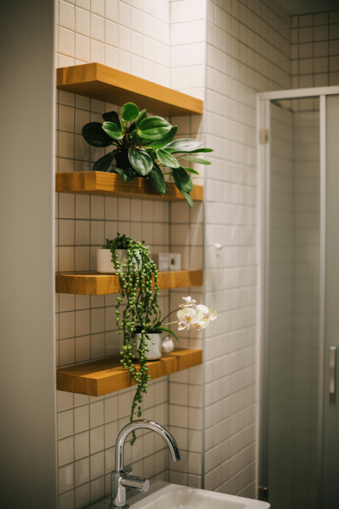 In small bathrooms, think up. Floating wood shelves are a game-changer (and easy to install with basic tools). I like arranging a mix of small plants think peperomia, string of pearls, or even a miniature orchid at different levels. In one tiny city flat, I used three shelves, each 60 cm (24 in) long, staggered at 30 cm (12 in) intervals. Pro tip: Waterproof the shelves with a clear sealant, and always use saucers to protect the finish.