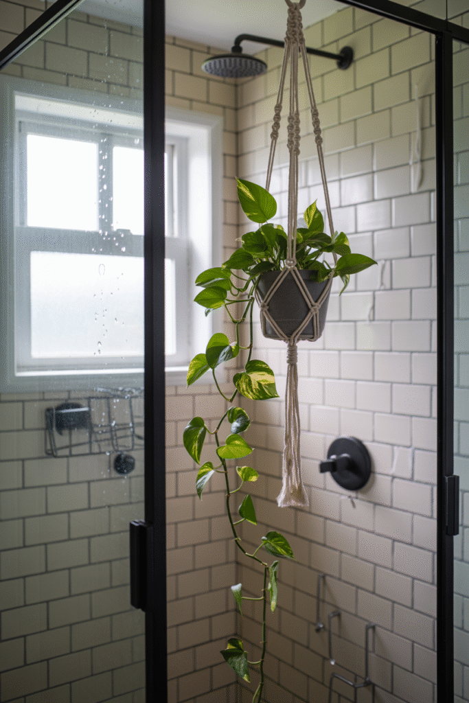 If your shower stall looks a bit stark, try installing a small hanging basket with a trailing plant just outside the splash zone pothos or philodendron work beautifully. In my downstairs powder room, I hung a 15 cm (6 in) macramé hanger from a shower curtain rod and let a golden pothos cascade down. The effect was instant vintage spa vibes. Make sure the pot has drainage holes and a saucer to catch drips. Pro tip: If your shower gets direct light, a spider plant is another great choice.