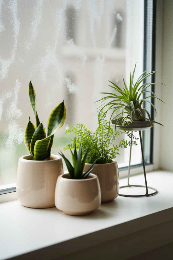 If your bathroom has a windowsill even a narrow one piling up a mix of small pots in different heights adds instant charm. I like grouping air plants (tillandsias), baby snake plants, and a tiny fern at varying heights. Choose glazed ceramic pots to protect surfaces from water damage. In a recent project, lining up three 10 cm (4 in) pots with different textures created a living mini-garden that guests kept asking about. Avoid this: Placing thirsty plants where someone might knock them over while brushing teeth.