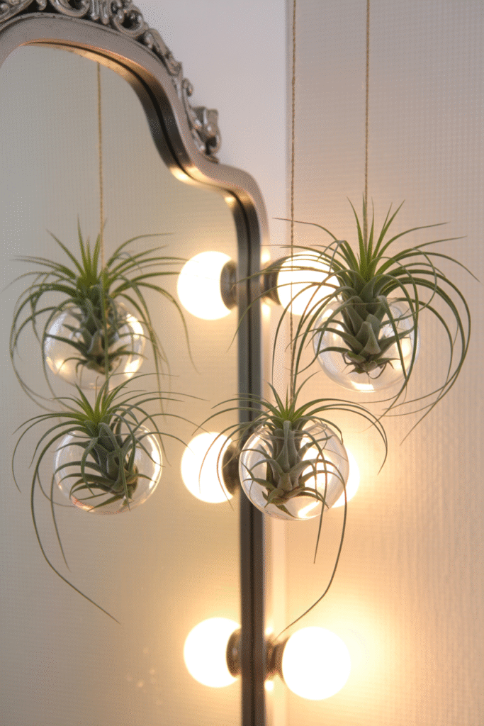 Air plants are foolproof for bathrooms with no windows they don’t even need soil. Hang a few glass globes with built-in hooks near a mirror or light fixture, and drop in tillandsias. I once helped a client with a basement bathroom by hanging three globes at different heights; the reflection from the mirror made it feel like a greenhouse. Just soak the plants for 10 minutes weekly and shake off excess water. Pro tip: Use fishing line for an invisible hanging effect.