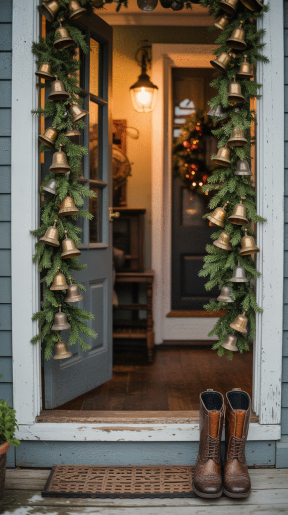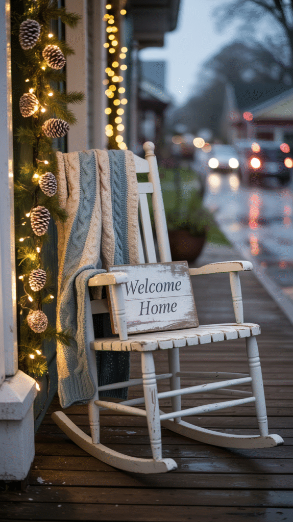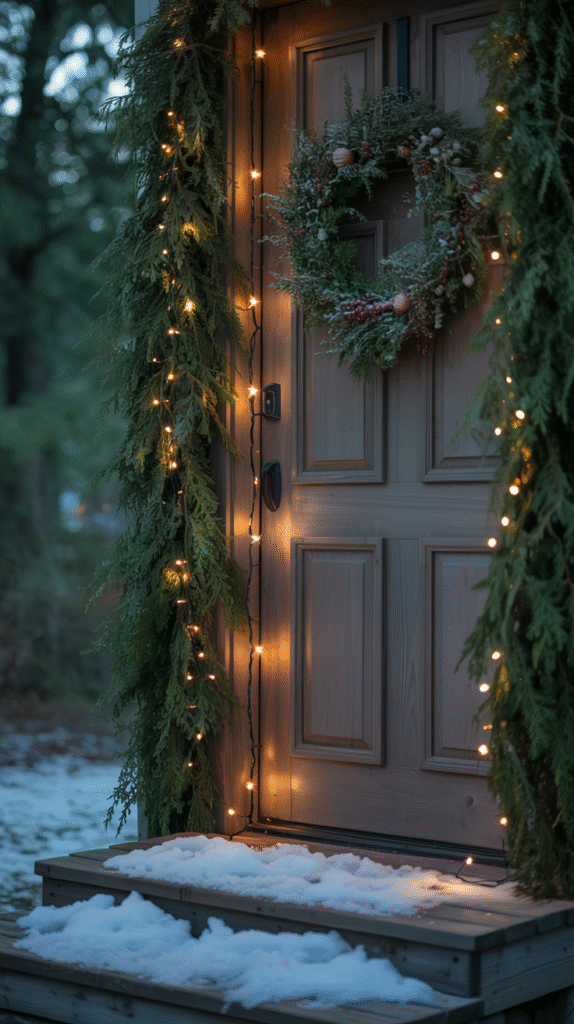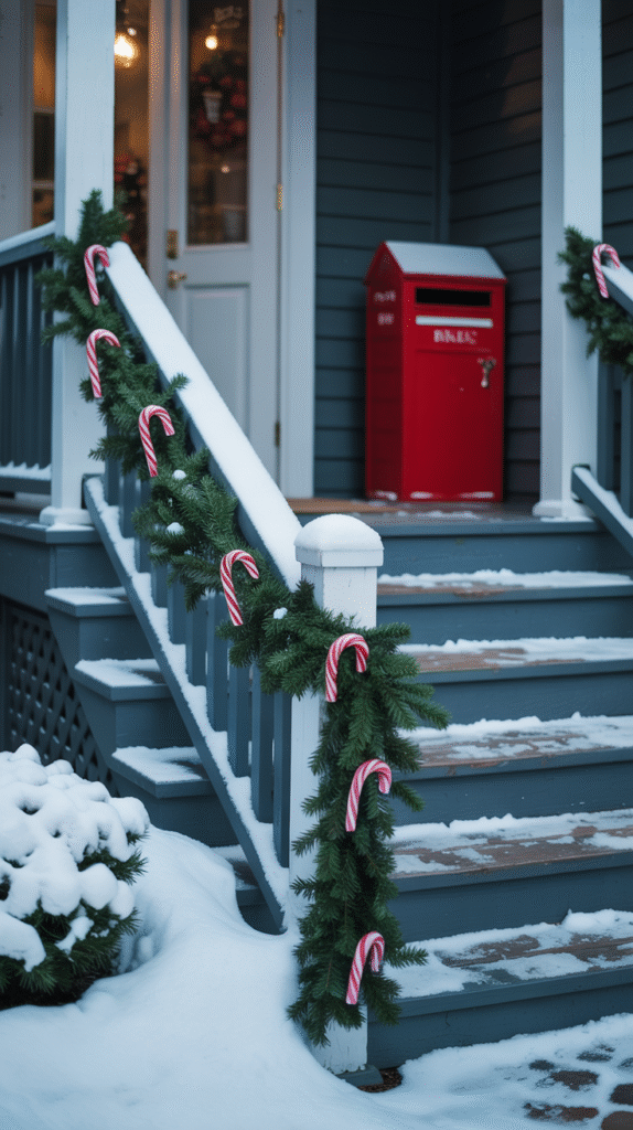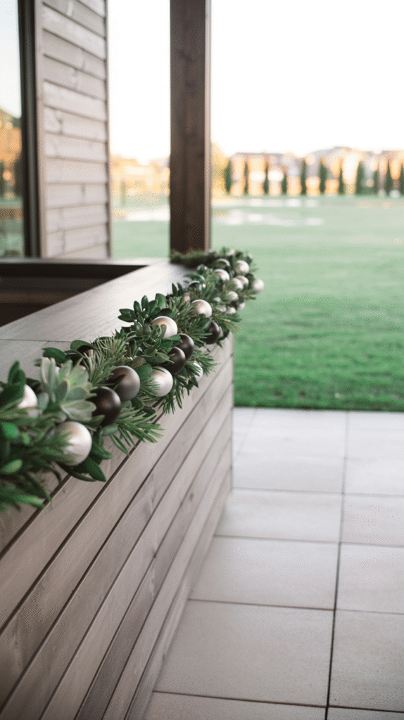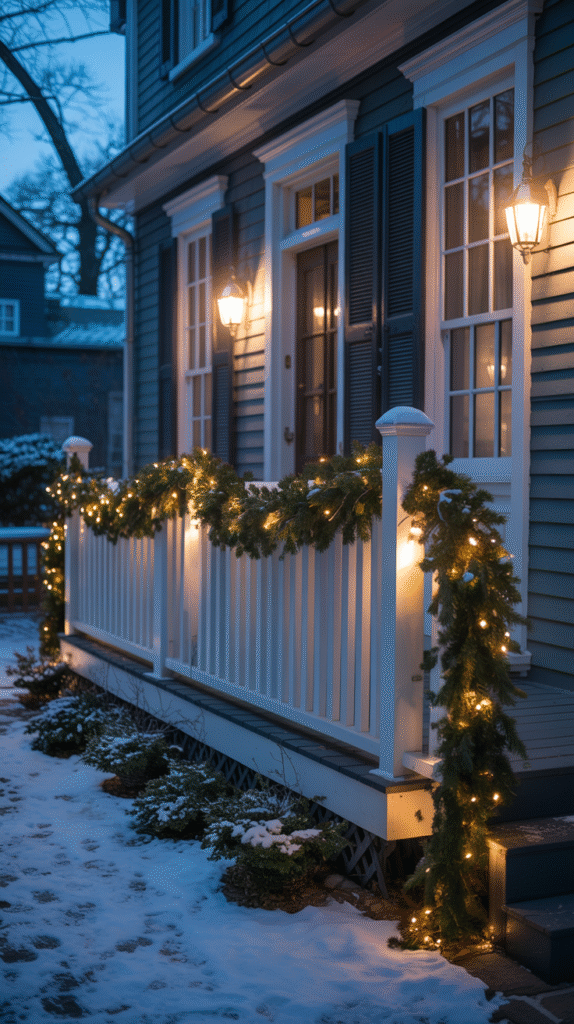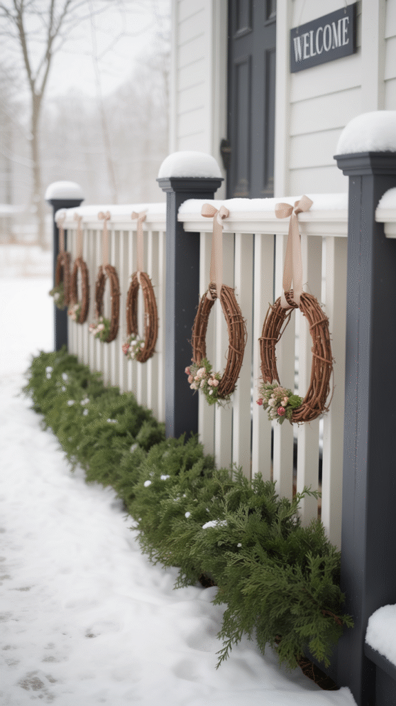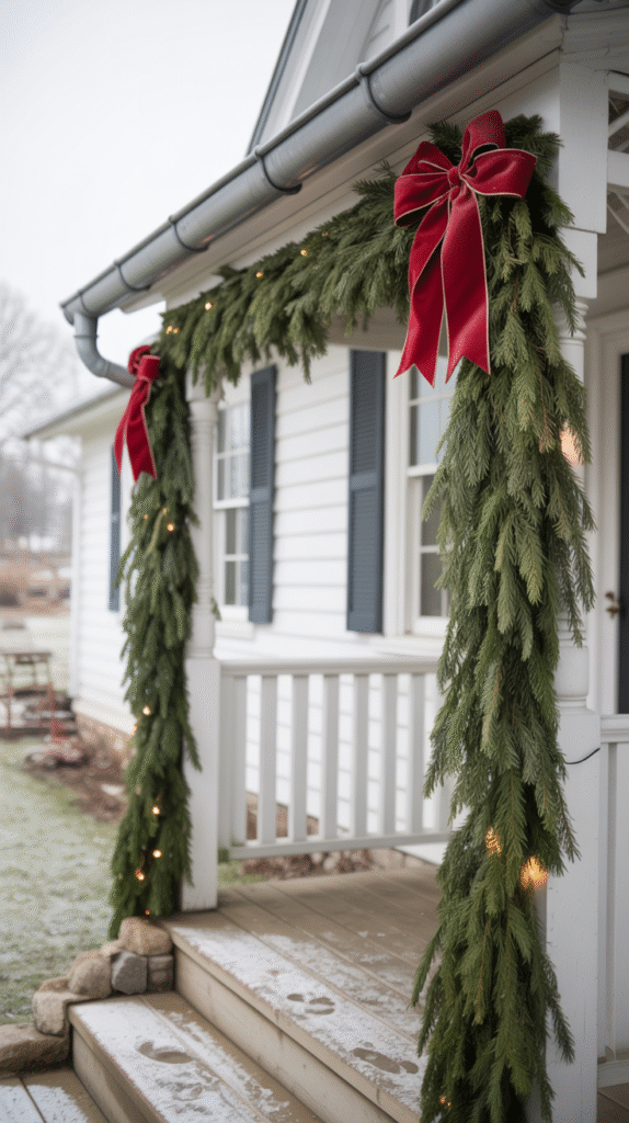 For a timeless look, drape a fresh pine garland along the top rail. I like to use a garland that’s 3 meters (10 feet) long for a standard porch. Attach it with zip ties every 30–45 cm (12–18 inches) for a secure hold. Add red velvet bows at each end—just wire them on. This setup takes 30 minutes and costs ($15–$20).