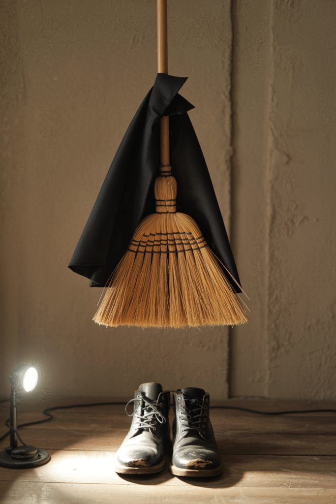 I saw this in a friend’s house and had to copy it. Lean a broomstick (straight from Home Depot or a thrift store) in a corner, add some witchy boots at the base, and drape a cape or shawl over the broom. If you have a motion-activated light, tuck it behind the cape for a subtle “vanishing act” effect.