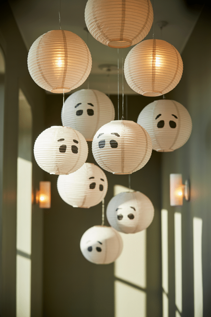 These are a hit in our house. Take small white paper lanterns (15–20 cm / 6–8 in diameter), draw simple ghost faces with a black marker, and hang them from the ceiling with fishing line or ribbon. Try clustering three to five at different heights for a floating effect.