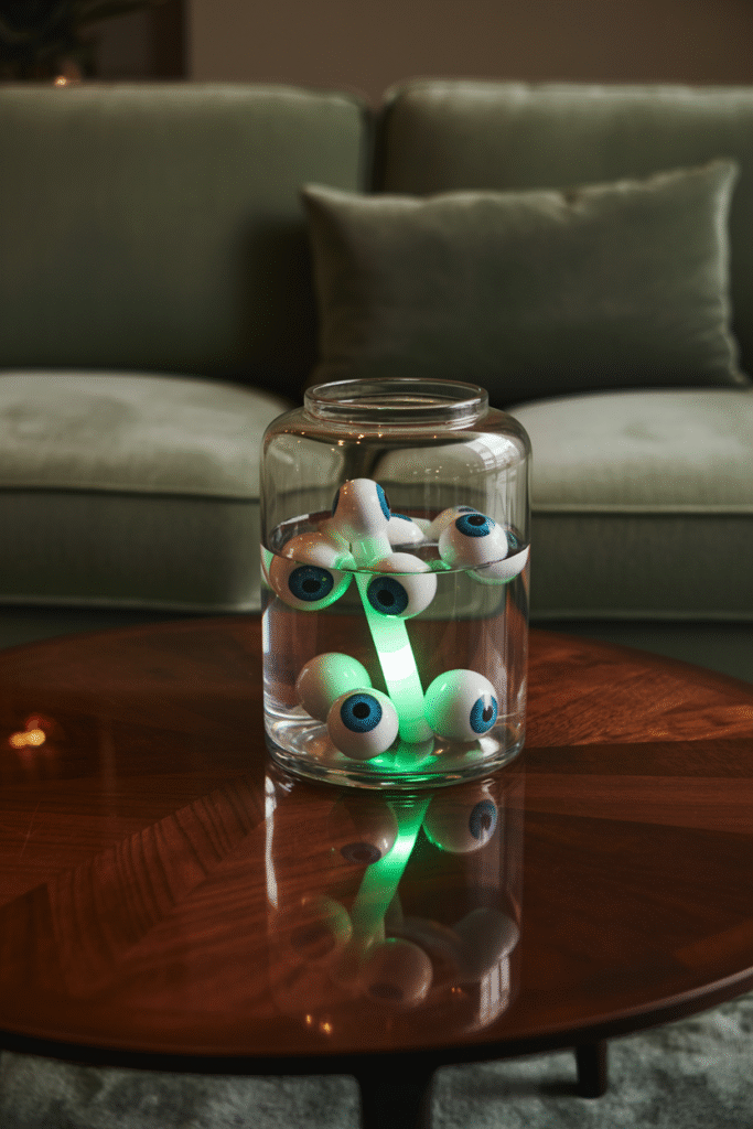 Take a big glass jar or a wide-mouth vase and fill it with water, then add floating plastic eyeballs (party supply stores have them by the dozen). Drop in a green glow stick for an extra “mad scientist” effect. Set it on your coffee table or console for a conversation starter.