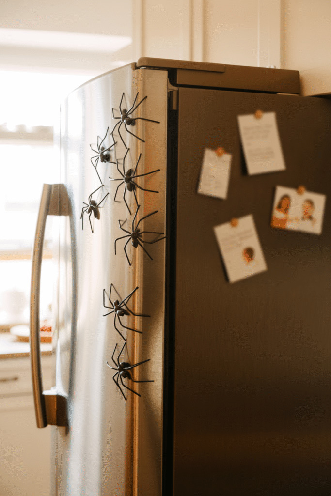 Years ago, I bought a bag of plastic spiders on a whim. Now, I toss a handful onto the fridge or filing cabinet every Halloween. It’s the easiest “wow” effect—and tots love the surprise factor. For a more advanced version, glue tiny magnets to the spiders’ bellies and let them crawl up appliances, picture frames, or metal doorways.