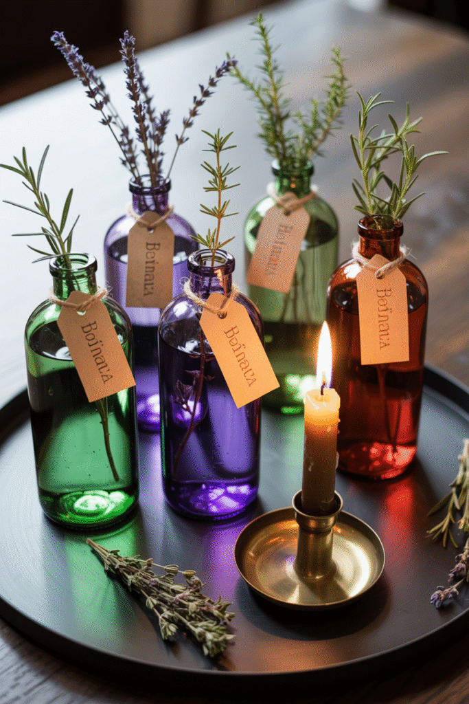 I’ve collected vintage-looking glass bottles from thrift stores for years. Clear out the labels, fill them with colored water (green, purple, red food dye), and add tags with fun names like “Bat’s Brew” or “Witch’s Tears.” Place them on a tray with dried herbs, candles, and a roll of parchment.