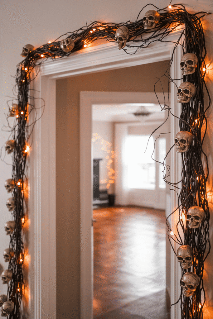 Forget the same old tinsel. Collect faux branches, leaves, or vines (dollar store finds are fine) and weave them together with fairy lights, little skulls, or miniature pumpkins. Hang the garland above your front door or across a large window.