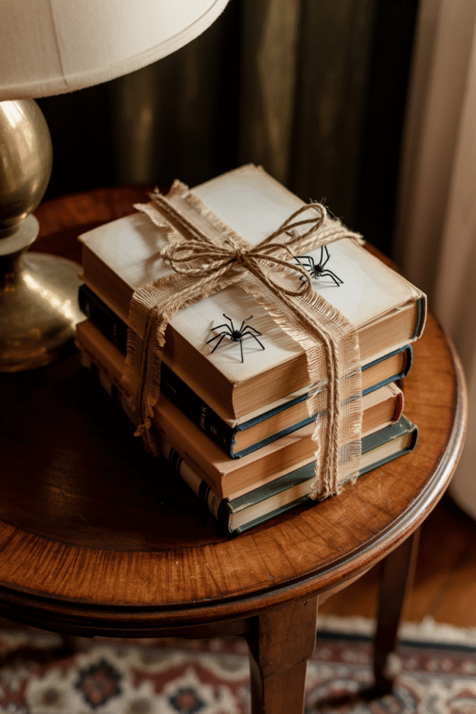 Old books instantly add texture and an eerie library feel. Gather a stack, wrap them in gauze, and tie them with twine or ribbon. Tuck plastic spiders or tiny skulls between the pages. I’ve even sprayed some with watered-down black paint for a “dusty” effect.