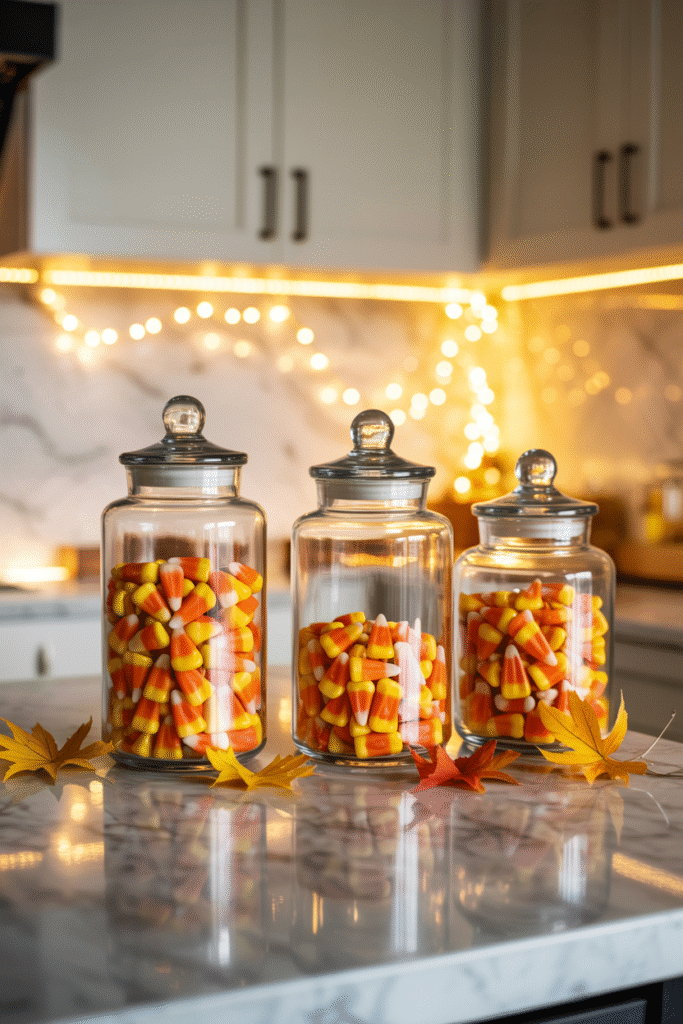 Candy corn is divisive to eat, but it’s a classic visual. Fill clear glass jars (mason jars, vases, even drinking glasses) with layers of orange, yellow, and white candy. Stack them on your dining table, mantel, or entryway console.
