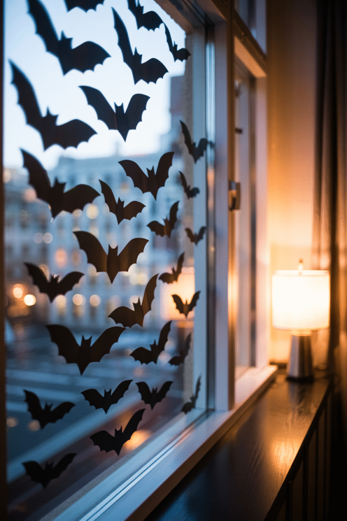 Cut simple Halloween shapes—bats, cats, ghosts—from black construction paper or adhesive vinyl. Stick them to your windows facing outward. When the sun sets, your silhouettes will cast shadows indoors, and when the lights are on inside, they’ll be visible from the street.