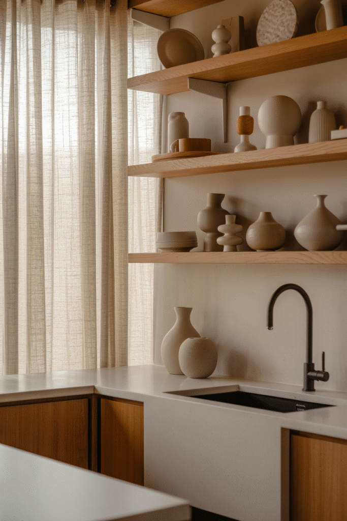Combine wood, stone, and metal for depth. In a recent kitchen, we paired white oak floating shelves, a matte black faucet, and a white quartz counter—each material stands out but they all work together.