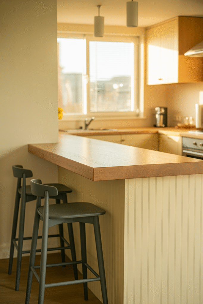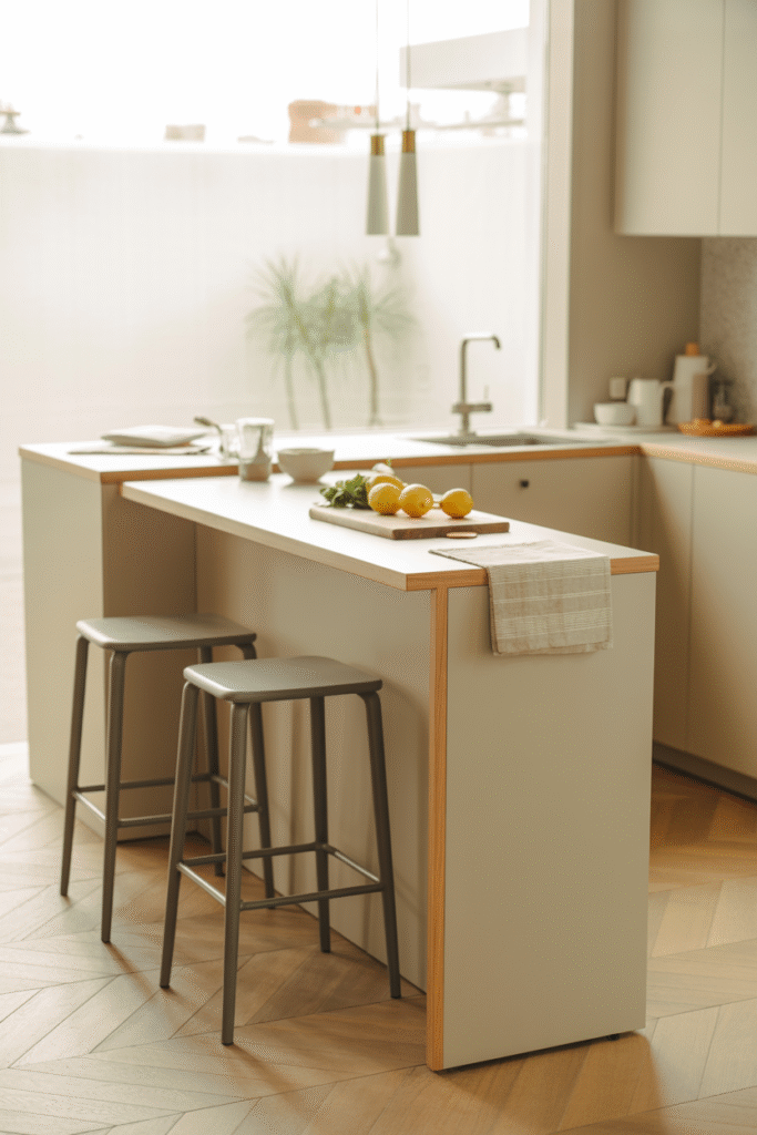 Mix counter heights to define “zones” without walls. For example, a 90 cm (36 in) prep area by the sink and a 105 cm (42 in) bar-height section for casual dining. This works wonders in small apartments. I’ve used Ikea SEKTION cabinets for the base, with custom plywood tops painted in a matte finish.