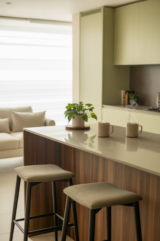 Not ready for total openness? Try a half-wall with open shelving or a bar counter with stools. In a compact flat, we left a 60 cm (24 in) pony wall, topped with a thick oak slab—a perfect spot for coffee and laptops.