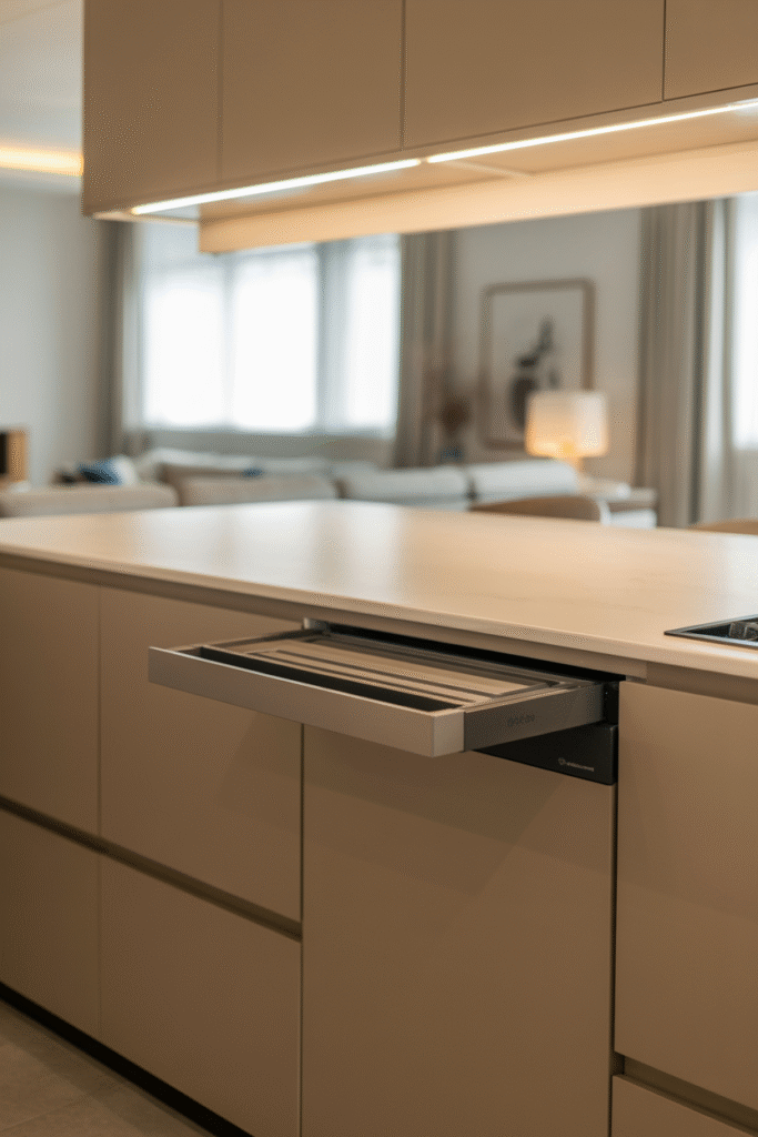 If you have pets, plan for them. I’ve added pull-out feeding drawers and a pet bed nook under the island. A client even built a tiny pet gate that folds down from the cabinet when needed.
