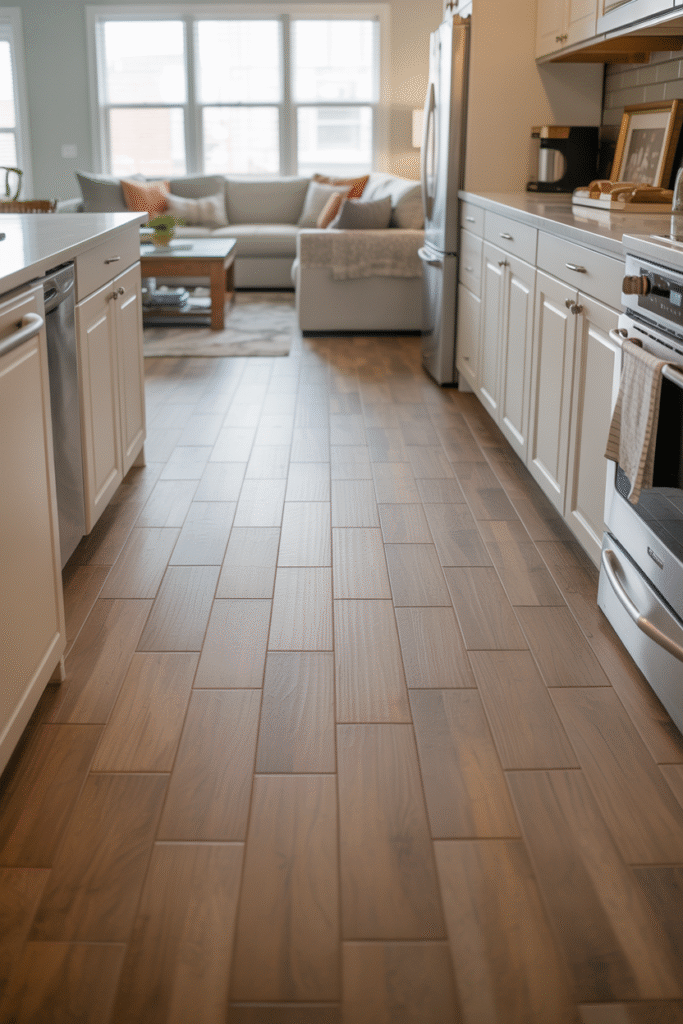 Open kitchens mean more foot traffic. I love luxury vinyl plank for its warmth and durability—it can handle spills better than hardwood. A client with three kids chose a wood-look tile that’s nearly indestructible and costs about ($30/sq ft). Pro tip: Run the same flooring throughout for a seamless look.