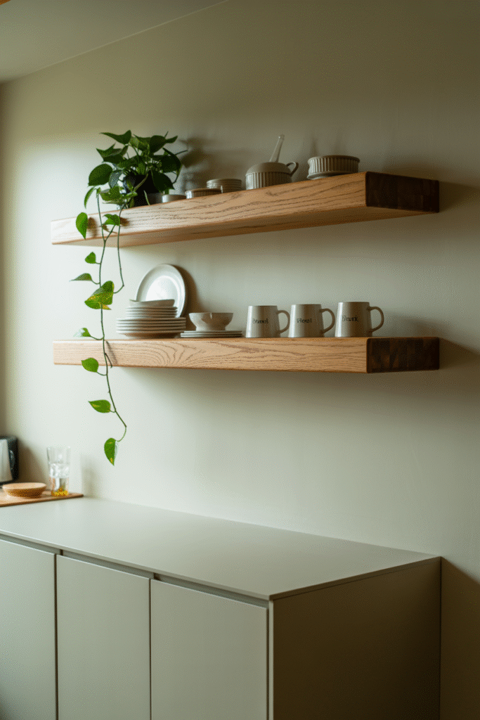Open shelves look great—if you keep them curated. I reserve them for daily-use dishes, cookbooks, and a few plants. Anything else becomes dust magnet. In my kitchen, two 60 cm (24 in) oak shelves hold our favorite mugs and a trailing pothos. Avoid this: Overloading shelves with mismatched jars it’s visual chaos.