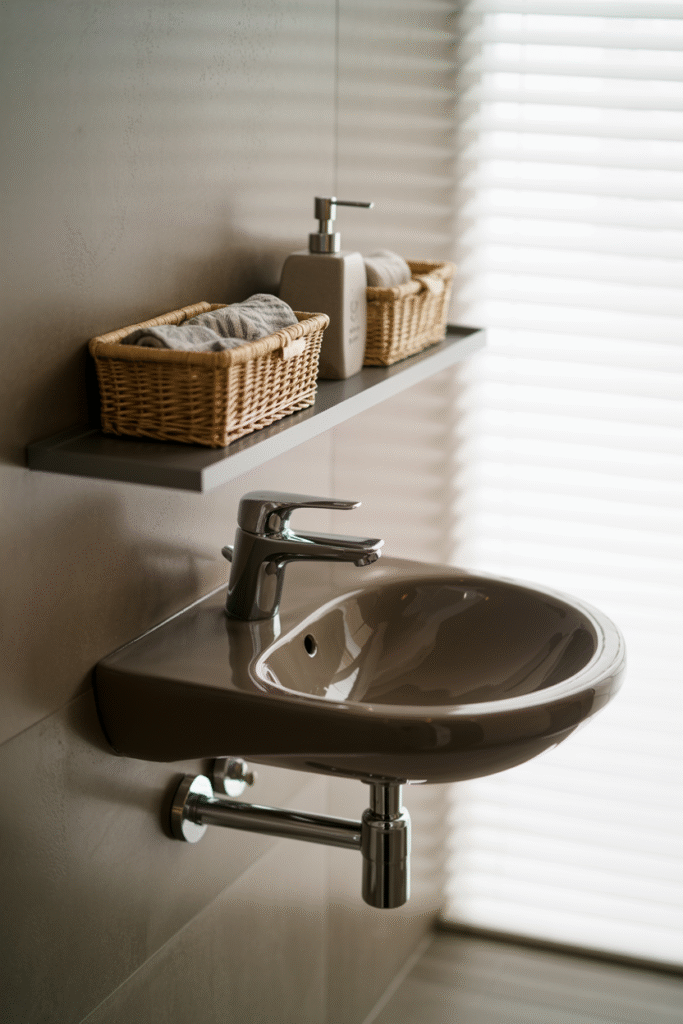 A sink that’s mounted directly to the wall, rather than perched on a vanity, gives you valuable storage space underneath and makes the room feel larger. In my own home, I installed a 45 cm (18 inch) round wall-mounted basin, and even though it was compact, it didn’t feel cramped. The open area below lets you see more of the floor, which tricks the eye into perceiving a bigger space.