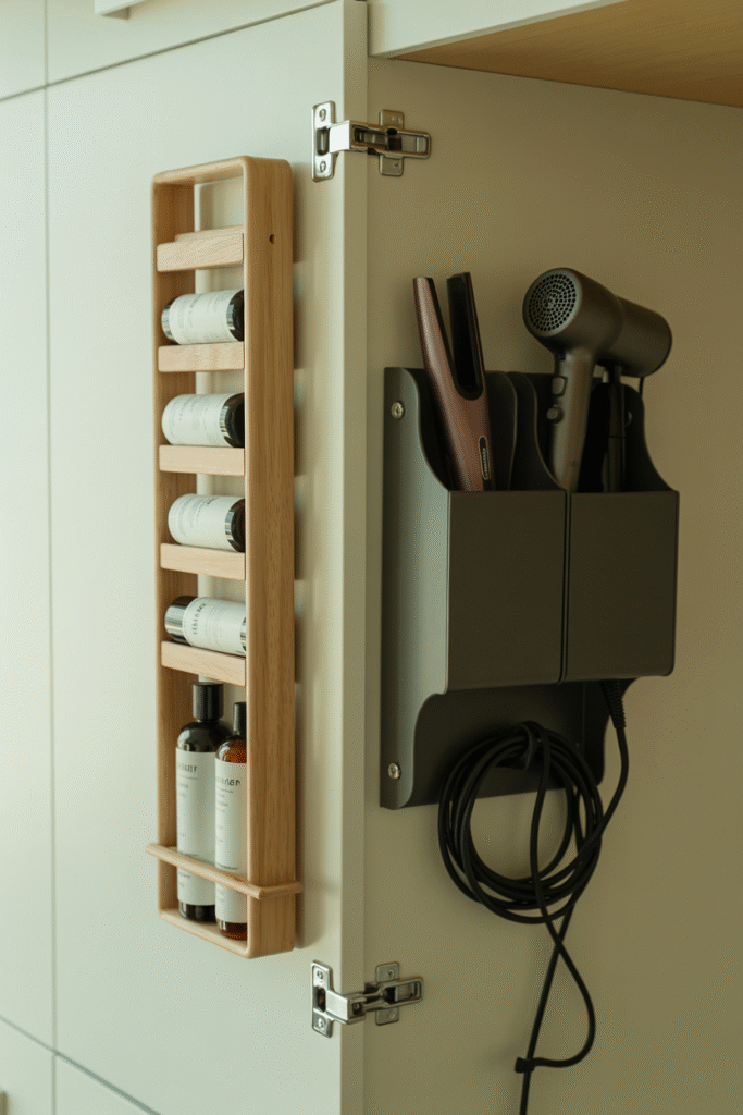 Raid your kitchen or office for storage ideas. For example, a spice rack mounted inside the cabinet door is a great for cosmetics, and a magazine rack can hold hairdryers or curling irons. I once used a slim bamboo dish drying rack next to the sink for rolled towels—not expensive, and it looked like it belonged there.