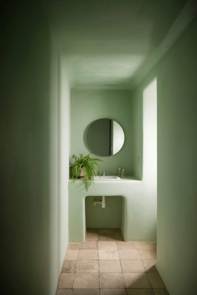 Painting your ceiling the same colour as your walls not stark white creates a cohesive, taller-looking space. In one 2m x 2m bathroom, we used a soft, airy shade of green ceiling-to-floor, and the client was amazed at how much more open it felt. This trick works especially well if you go for a colour one shade lighter than your walls.
