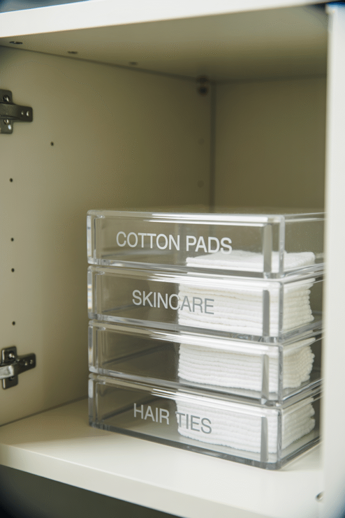 Opaque bins look neat but make it hard to see what’s inside. I’ve found that clear acrylic or glass organisers especially for cotton pads, Q-tips, and cosmetics keep your storage visible and help you actually use what you own. Stackable boxes also maximize shelf efficiency, and you’re less likely to double up on items you already have.